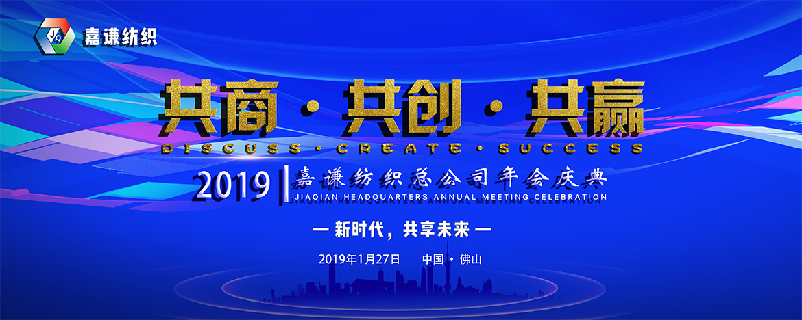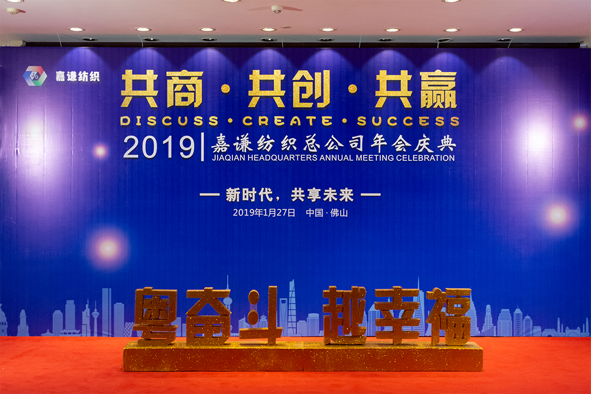 2019年1月27日,以“共商·共創(chuàng)·共贏”為主題的嘉謙紡織總公司年會慶典在富林朗悅酒店盛大舉行,廣東省紡織協(xié)會會長羅碚先生、中國針織T恤衫分會會長蔡劍華先生、廣東省軍區(qū)原副司令員倪增先生、優(yōu)秀戰(zhàn)略合作伙伴等特邀嘉賓,以及公司董事長蔡景輝先生、總經(jīng)理羅椿女士攜各銷售分公司、部門經(jīng)理、全體同事參加了晚會慶典。